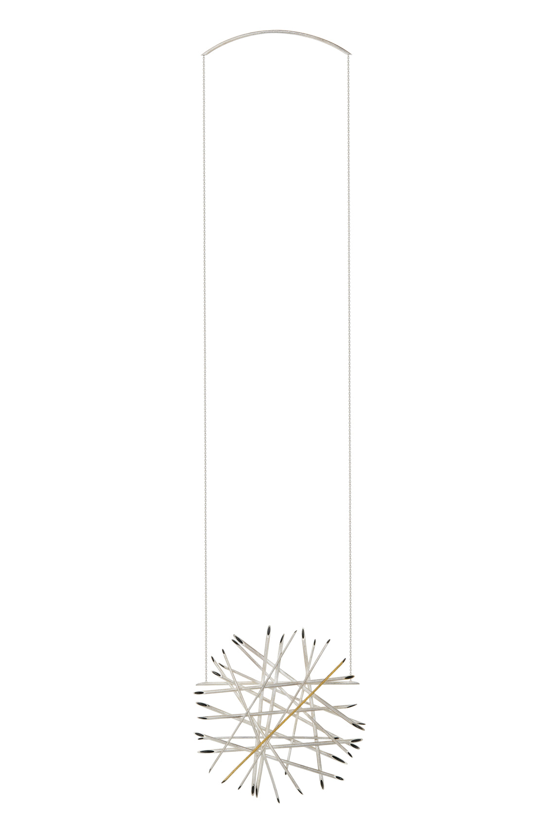 A one-off statement necklace designed to make an impact. The design is created with layers of chenier (tubes) to form a circular structure. Each section of chenier has been textured and oxidised and finished with an individual gold leafed piece.