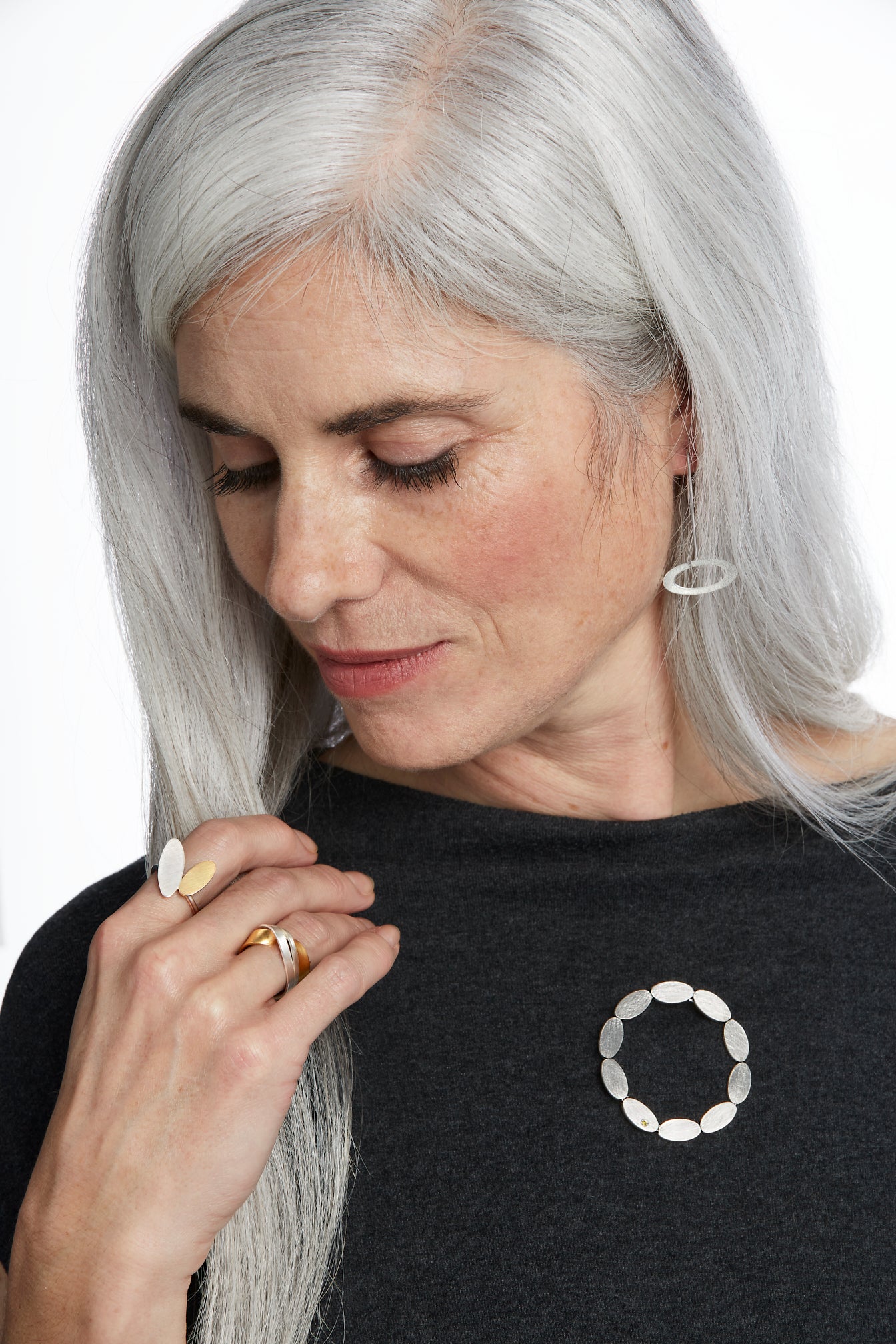 Ring is modelled with; North, South, East & West Bangle & silver & 18ct gold flyover ring with salt & pepper diamond