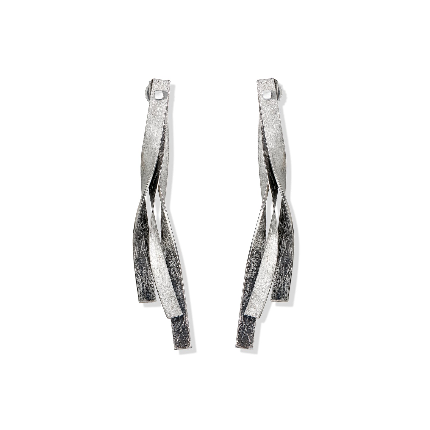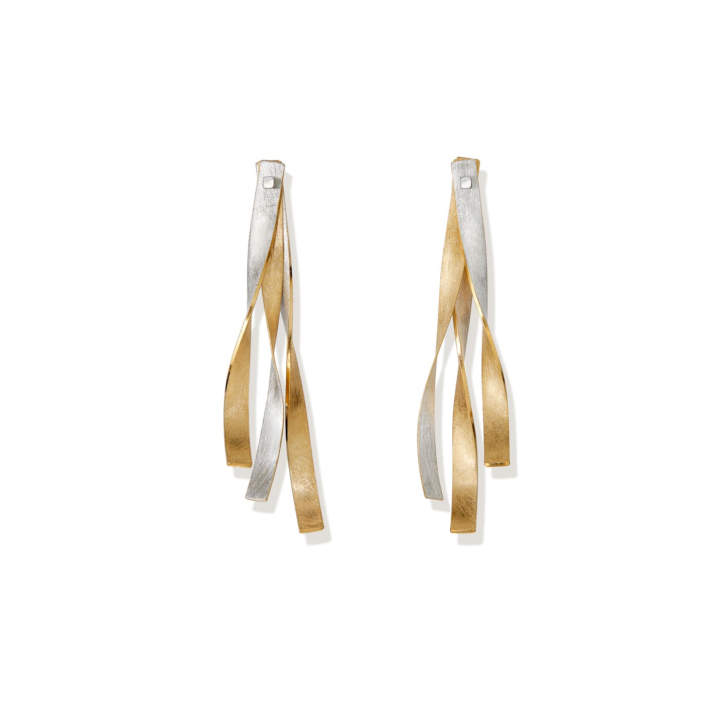 Fluid drop earrings with a stud fixing. These earrings are textured with either gold vermeil or oxidisation on one side and silver on the other. The wearer can select which side faces forward giving the earrings an individual look.